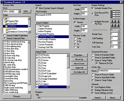 The main display of DWGBrowser is shown in the illustration. This is really one rather big dialog box, where you fill in information in the various boxes or select from drop-down lists to specify what you want done. Having done that, you click ‘Process’ and it creates a set of web-viewable files and runs the web browser.